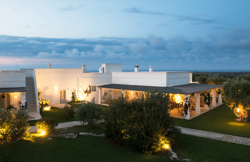 A masseria in the Valle d'Itria—set among UNESCO-protected olive groves that have been here for a thousand years. Fourteen rooms. A spa. A farm-to-table restaurant where the menu changes based on what's ripe that day. Views of the sea from the terrace, but also views of the land—the red earth, the ancient trees, the stone walls.